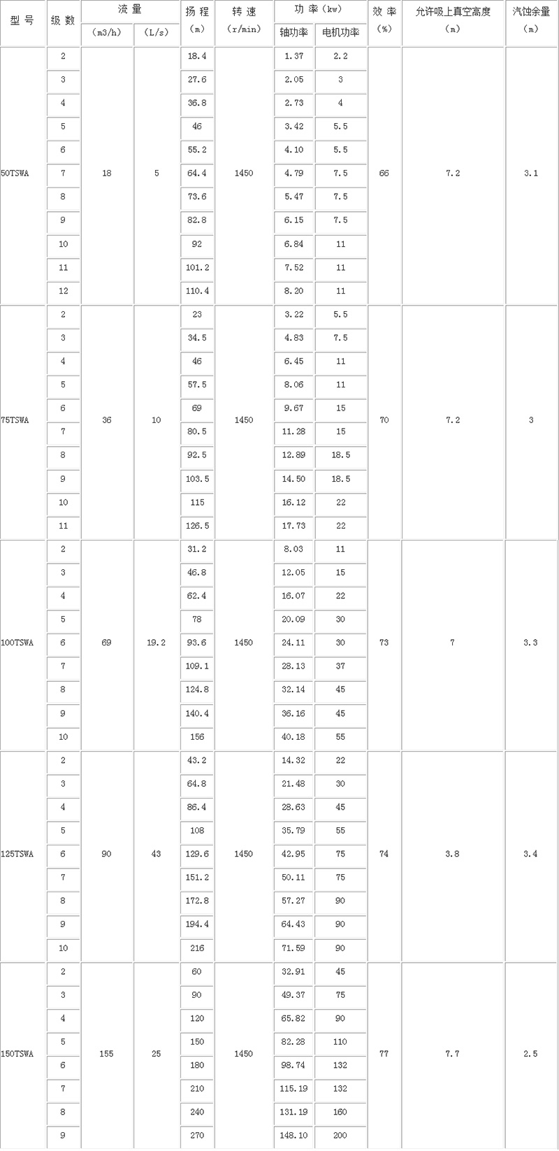 TSWA型多級離心泵性能參數表